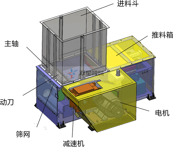 單軸撕碎機,主要由刀片主軸、定刀、承載箱體、箱體支架、進料系統(tǒng)、液壓推料系統(tǒng)、動力系統(tǒng)、電器控制系統(tǒng)組成。設備主要用于撕碎木材、橡膠、塑料、紙等廢料、機頭料。